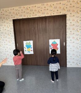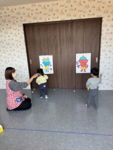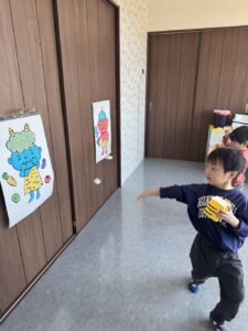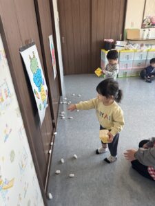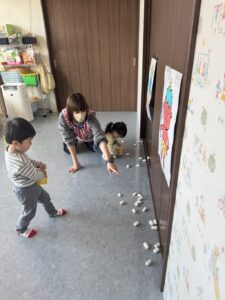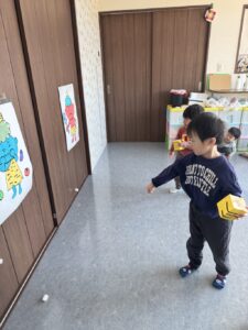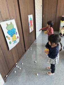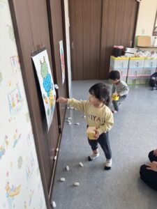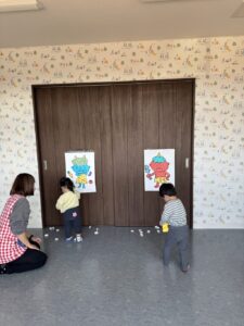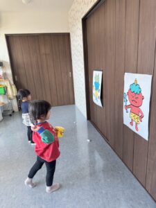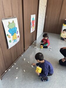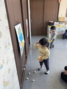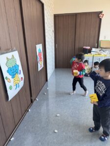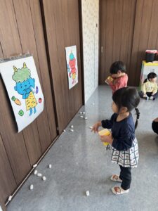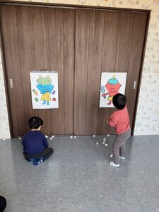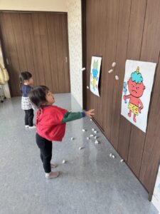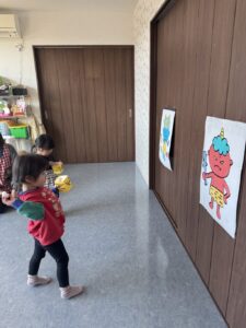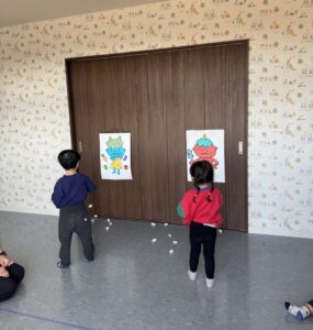 そら組さんは、お部屋の中で、豆まきの練習をしました。