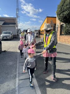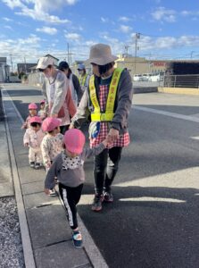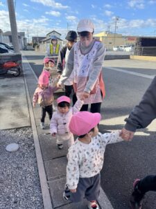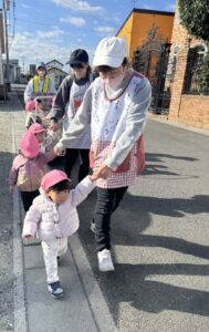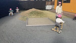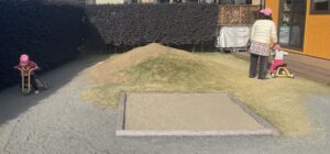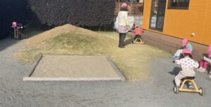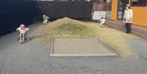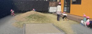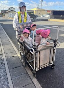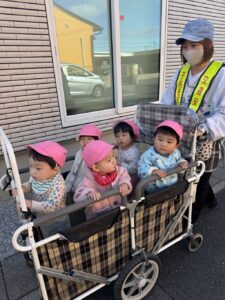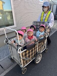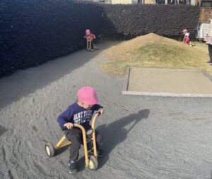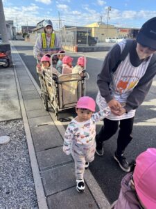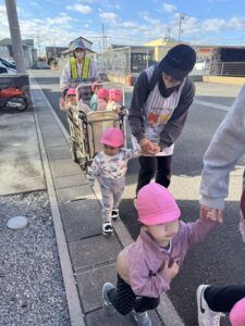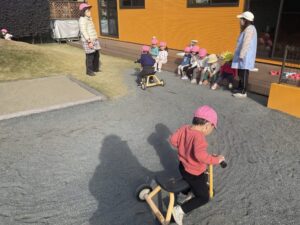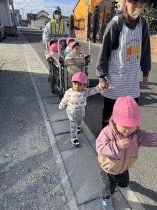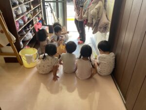 そら組さんは、園舎へ入る前に、上に着ていた服を自分で脱ぎ、自分の袋へ入れて、足を拭いてもらうのを座って待ちます。