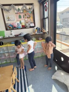 トイレと手洗いを済ませて、お部屋へ入り、①好きなズボンを出して履く。②肌着を脱ぐ。③薄地のTシャツを着るところまで、自分で行っています。