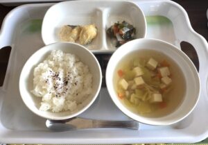 ゆかりごはん、タラの味噌マヨ焼き、大根と人参とわかめの甘酢和え、すまし汁でした。