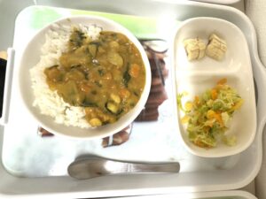 今日の給食は、チキンカレー、キャベツのサラダ、バナナでした。