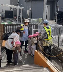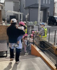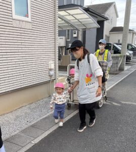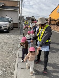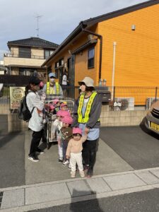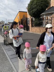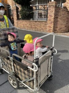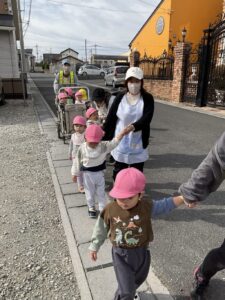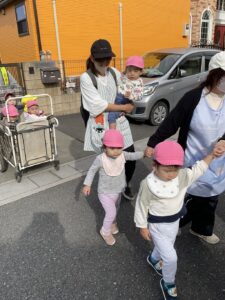 お支度をして、先にお散歩カーに乗るお友だちが準備して、その後、手を繋いで歩くお友だちが順番に出て、並んで出かけます。