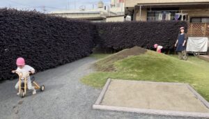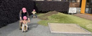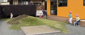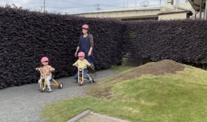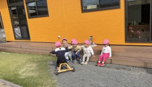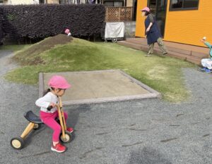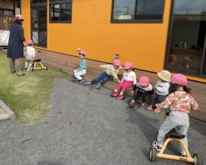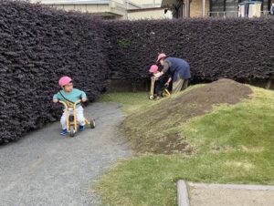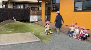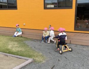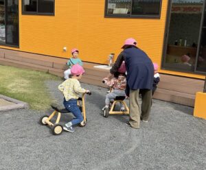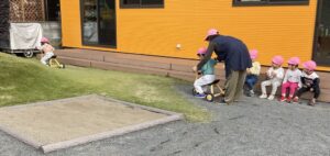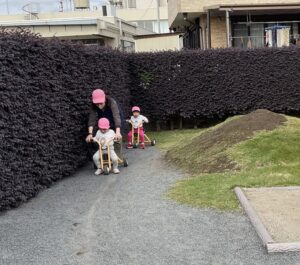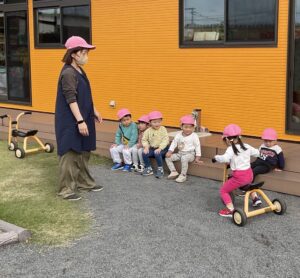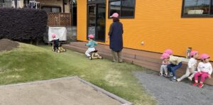 最初は、保育士が足で蹴ることを助言して、補助しながらでしたが、2巡目からは、皆、コツを掴み、自力で三輪車をこいでいました。