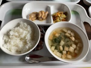白ごはん、鶏肉のさっぱり煮、キャベツのカレー炒め、お麩とほうれん草と大根と人参のお味噌汁でした。