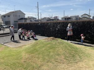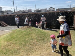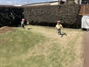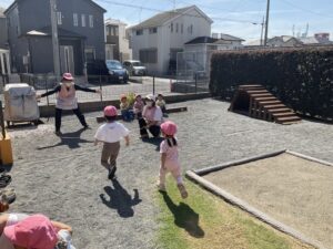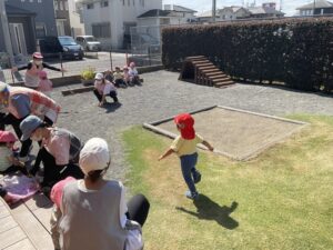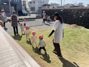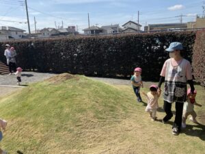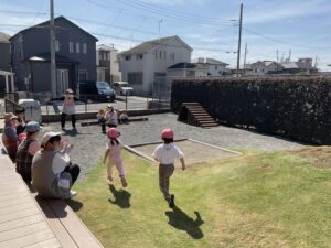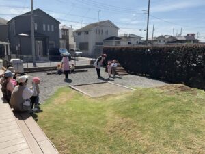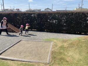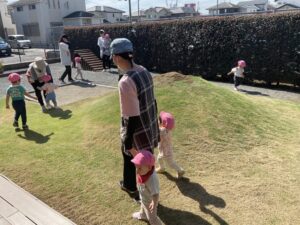 もも組さんは、園庭をいつもとは逆回りで歩きました。