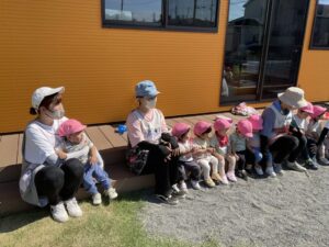 もも組さんは、ウッドデッキに座り、応援します。