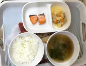 本日の献立は、 白ごはん、焼き魚(鮭)、そぼろ肉じゃが、玉ねぎ、にんじん、ナス、小松菜のお味噌汁でした。