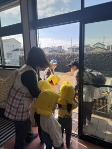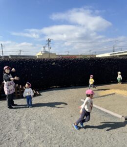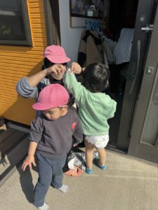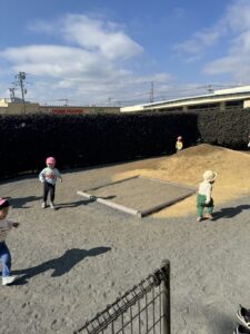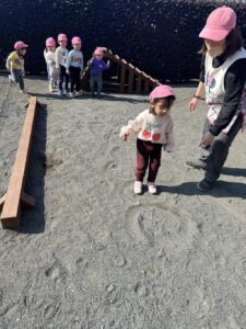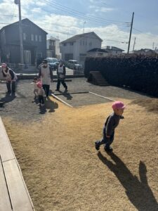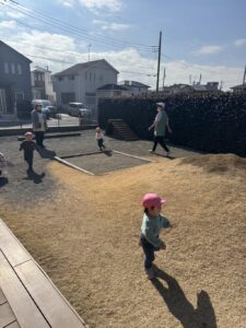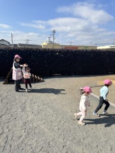 もも組さんがお部屋へ入る準備を始めたので、園庭を走りました。