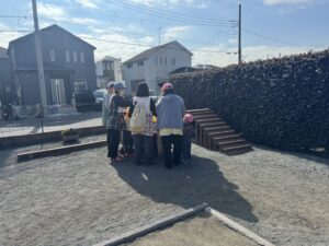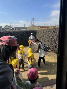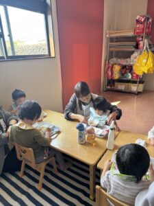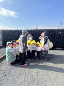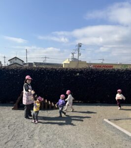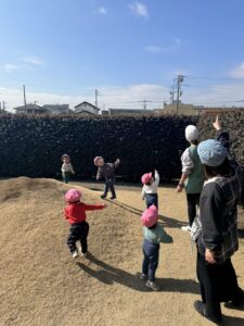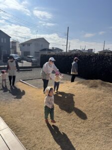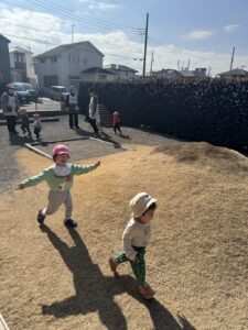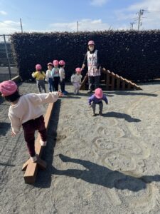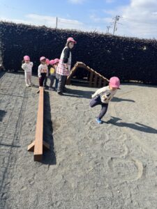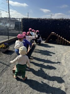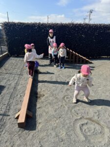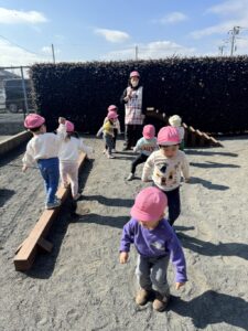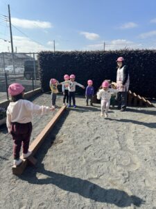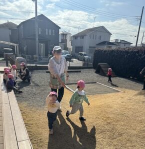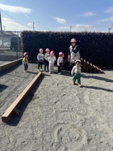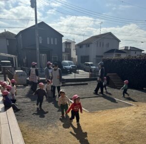 集まって、お話を聞いて、このまま園庭で身体を動かすことにしました。
