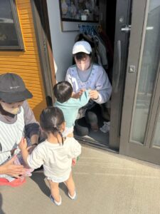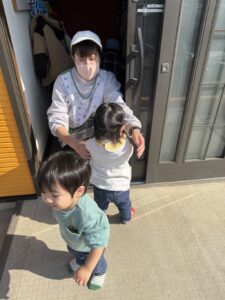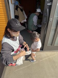 外で手を洗い、入り口でズボンと上に着ていた洋服を脱いで、足を拭いてもらい、部屋へ入り、自分で好きなズボンとTシャツを選んでお着替えします。