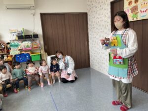 保育士さんからの催し物は、「3匹のこぶた」のエプロンシアターでした。